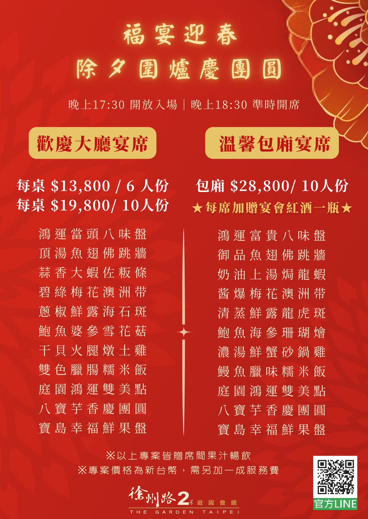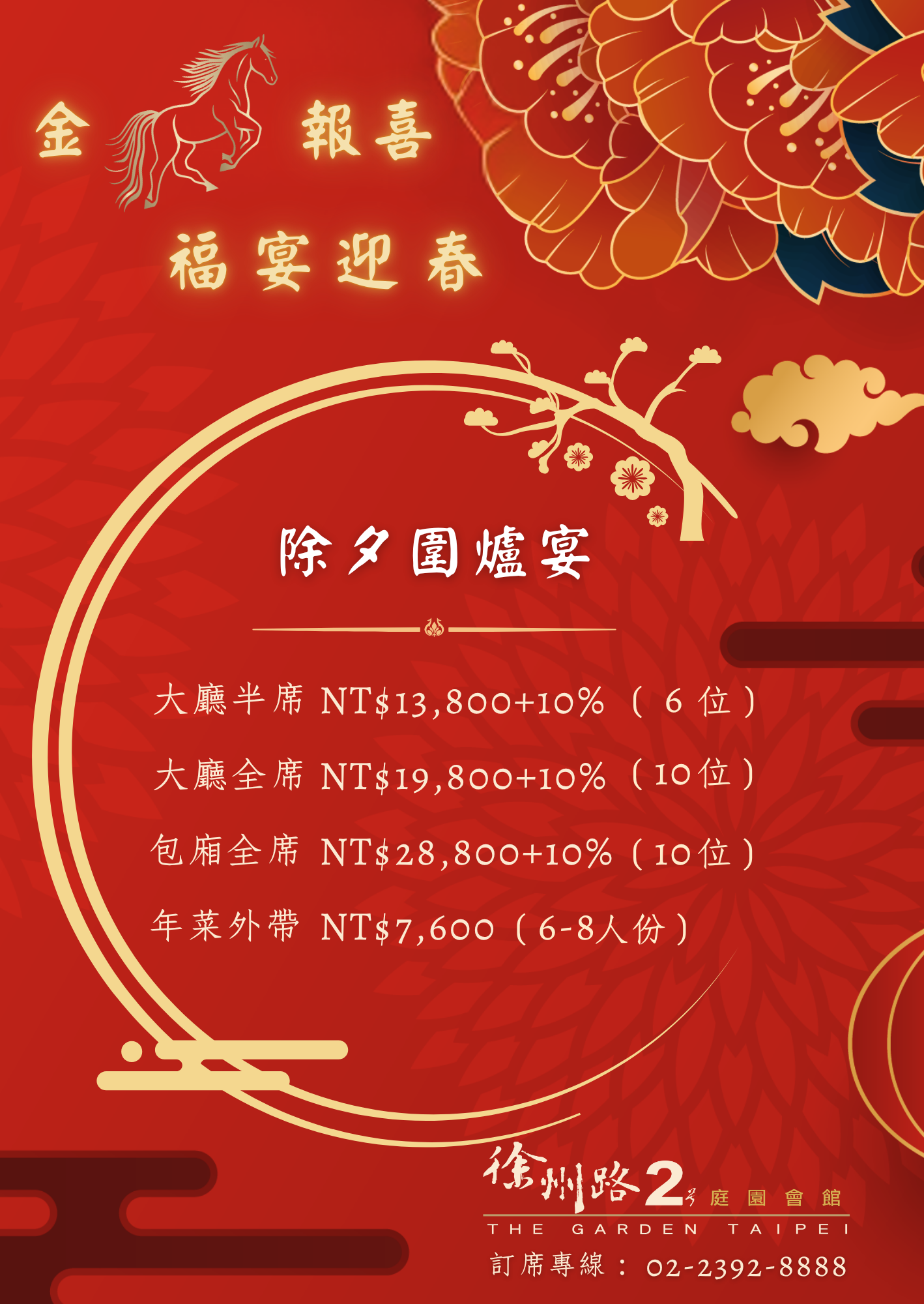 迎接團圓佳節,徐州路2号庭園會館精選時令食材,用心烹調多道經典年菜,推出除夕圍爐宴席,邀您與家人一起共享團圓盛宴!同時今年也有準備外帶年菜可供預訂,讓您在家也能輕鬆品味滿滿年味。